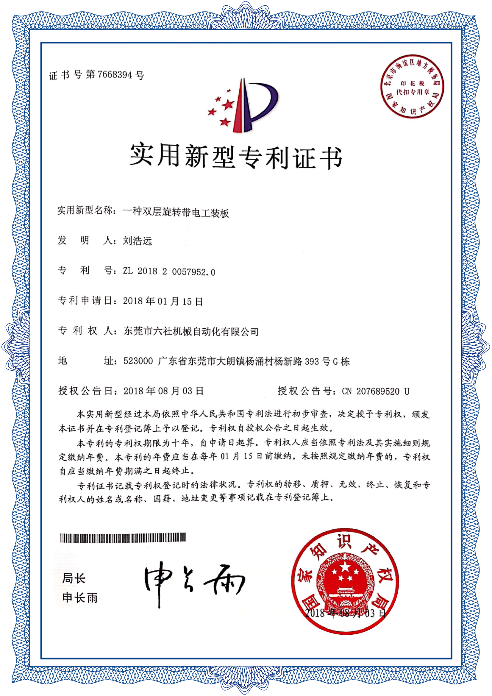 实用新型专利证书